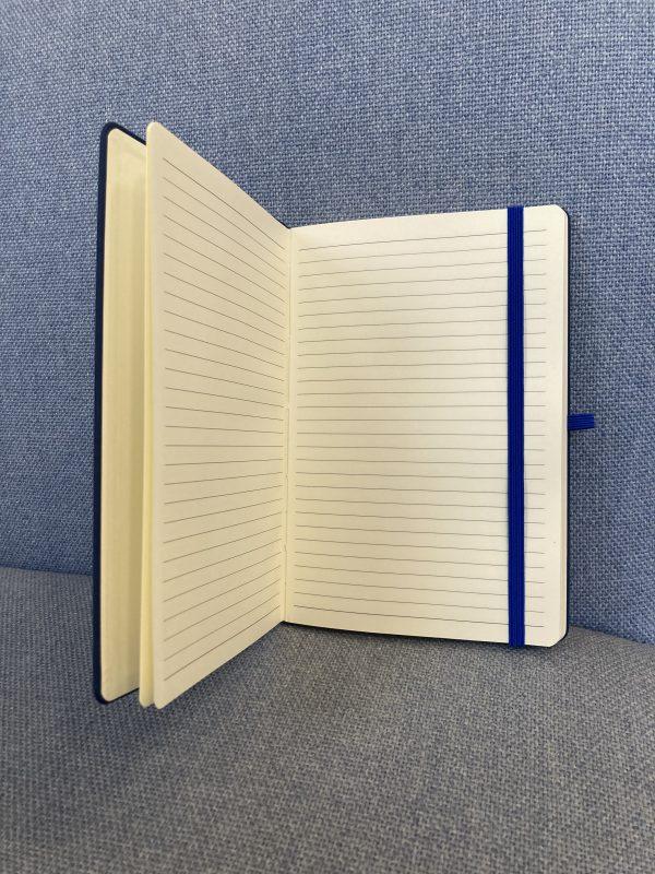 Handy soft-feel notebook, blue cover with cream lined paper, elasticated closure and pen loop.